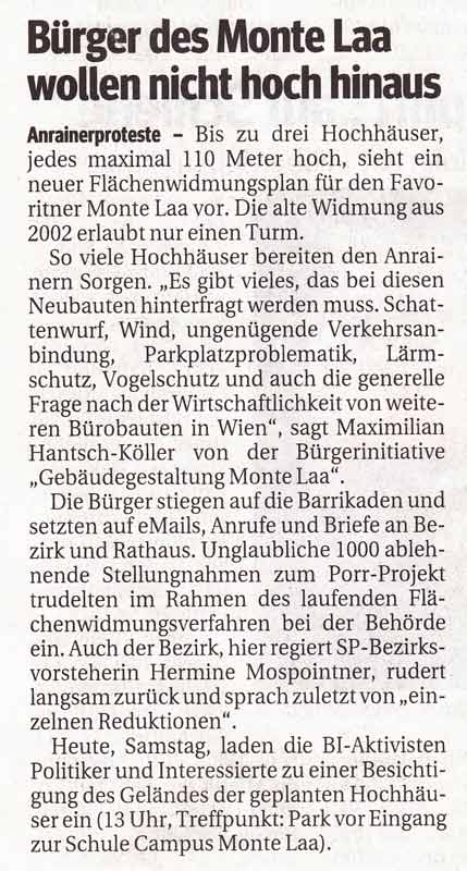 Die Bürgerinitiative Gebäudegestaltung Monte Laa (BIGG Monte Laa) lädt für Samstag, den 17.4.2010 ab 13:00h interessierte Journalisten, Politiker und Bürger zu einer Begehung und Besichtigung des Geländes des zukünftigen Hochhausprojekts Monte Laa.