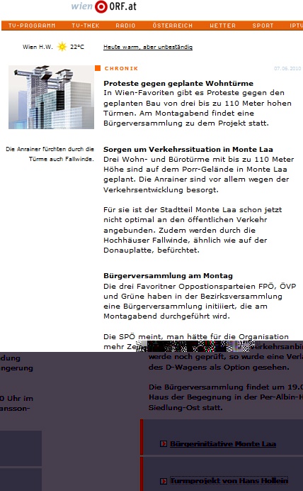 Montag, 7.6.2010, 19h - BürgerInnenversammlung zur Flächenwidmung ("Hochhausprojekt") Monte Laa