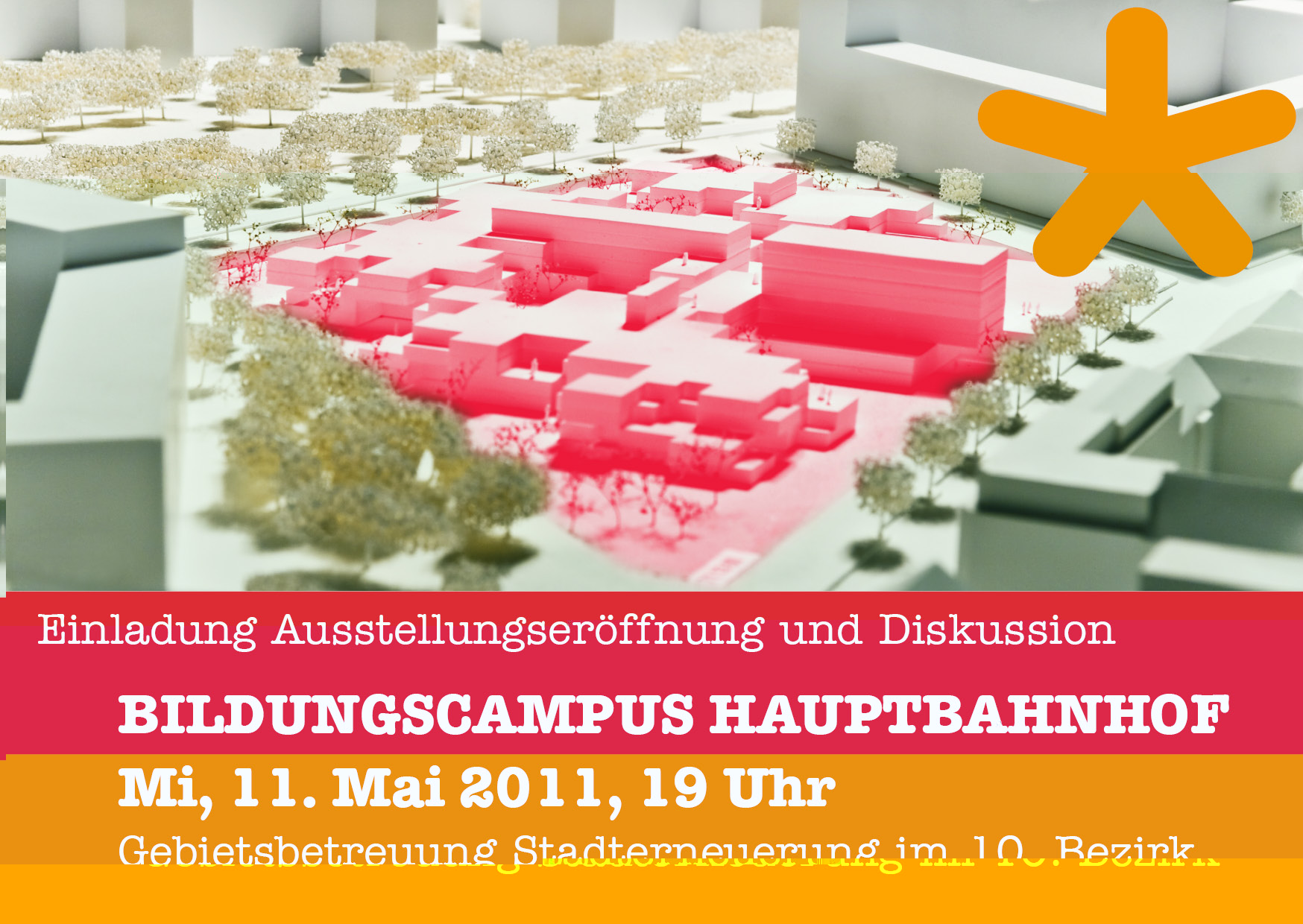 Der von der MA 19 ausgelobte Architekturwettbewerb Bildungscampus Hauptbahnhof ist entschieden. Im bahnrorama (Favoritenstraße 51) ist das Modell des Siegerprojekts von 2. bis 10. Mai zu sehen. Die GB*10 (Quellenstraße 149, im Hof) präsentiert die prämierten Projekte des Wettbewerbs von 12. Mai bis 01. Juni und lädt zum Informations- und Diskussionsabend am 11. Mai (19.00 Uhr).
